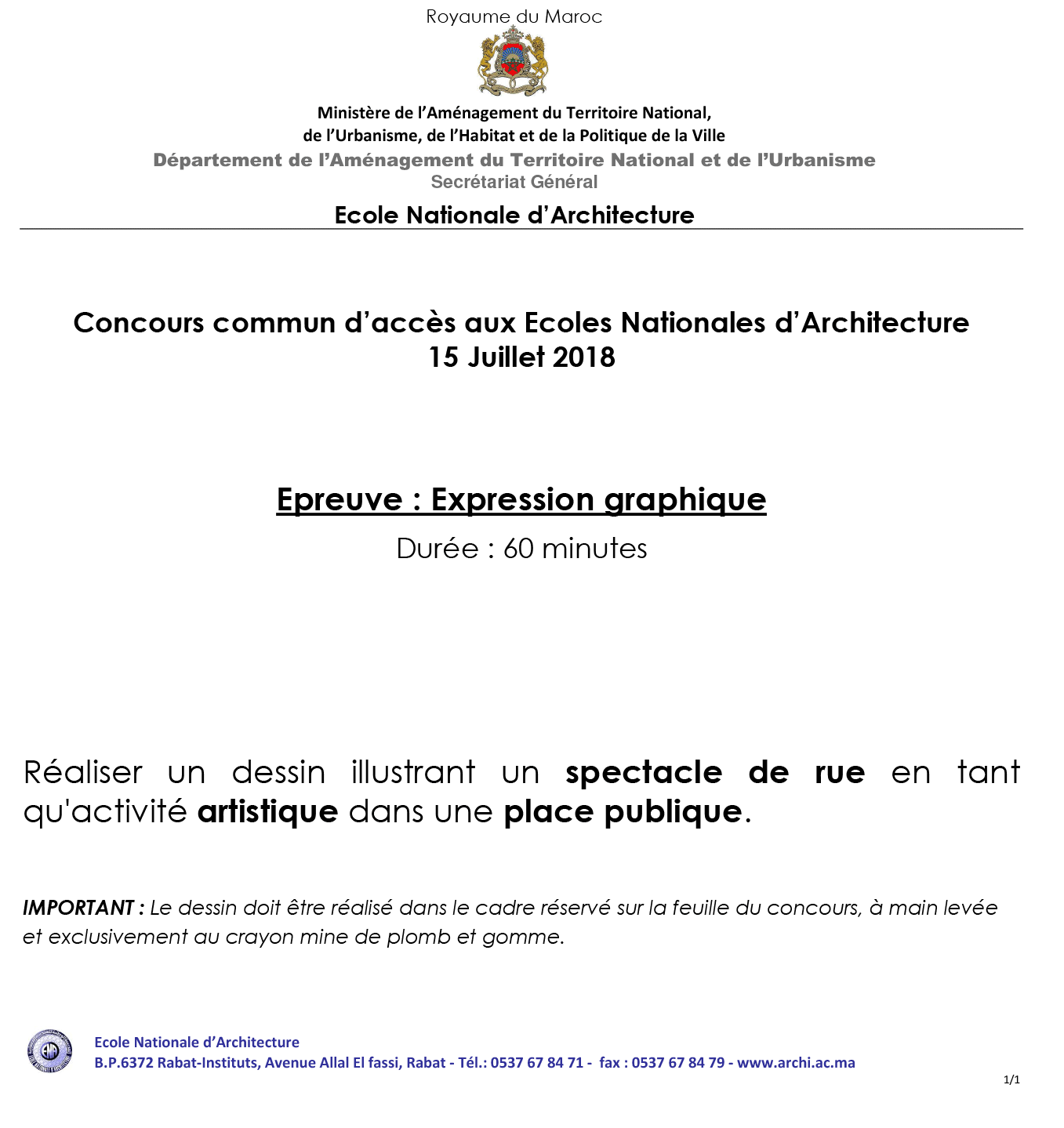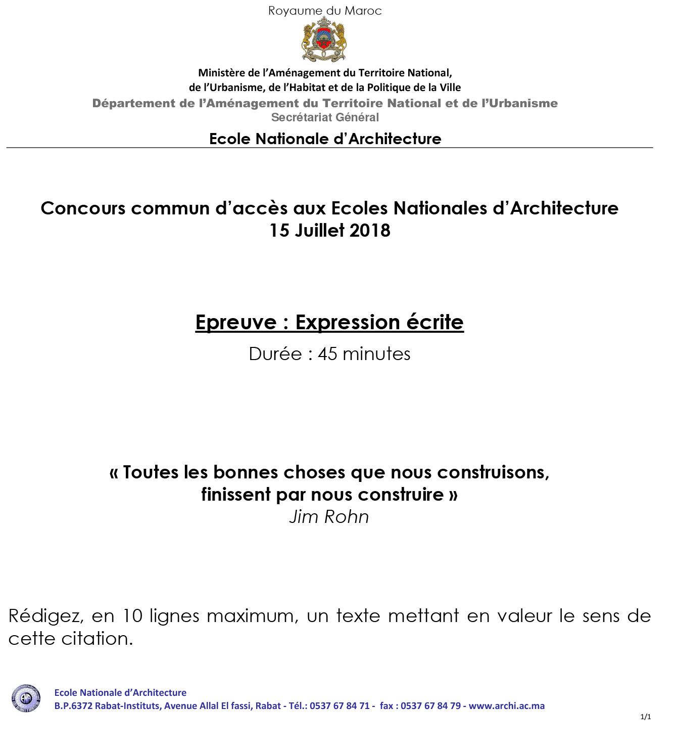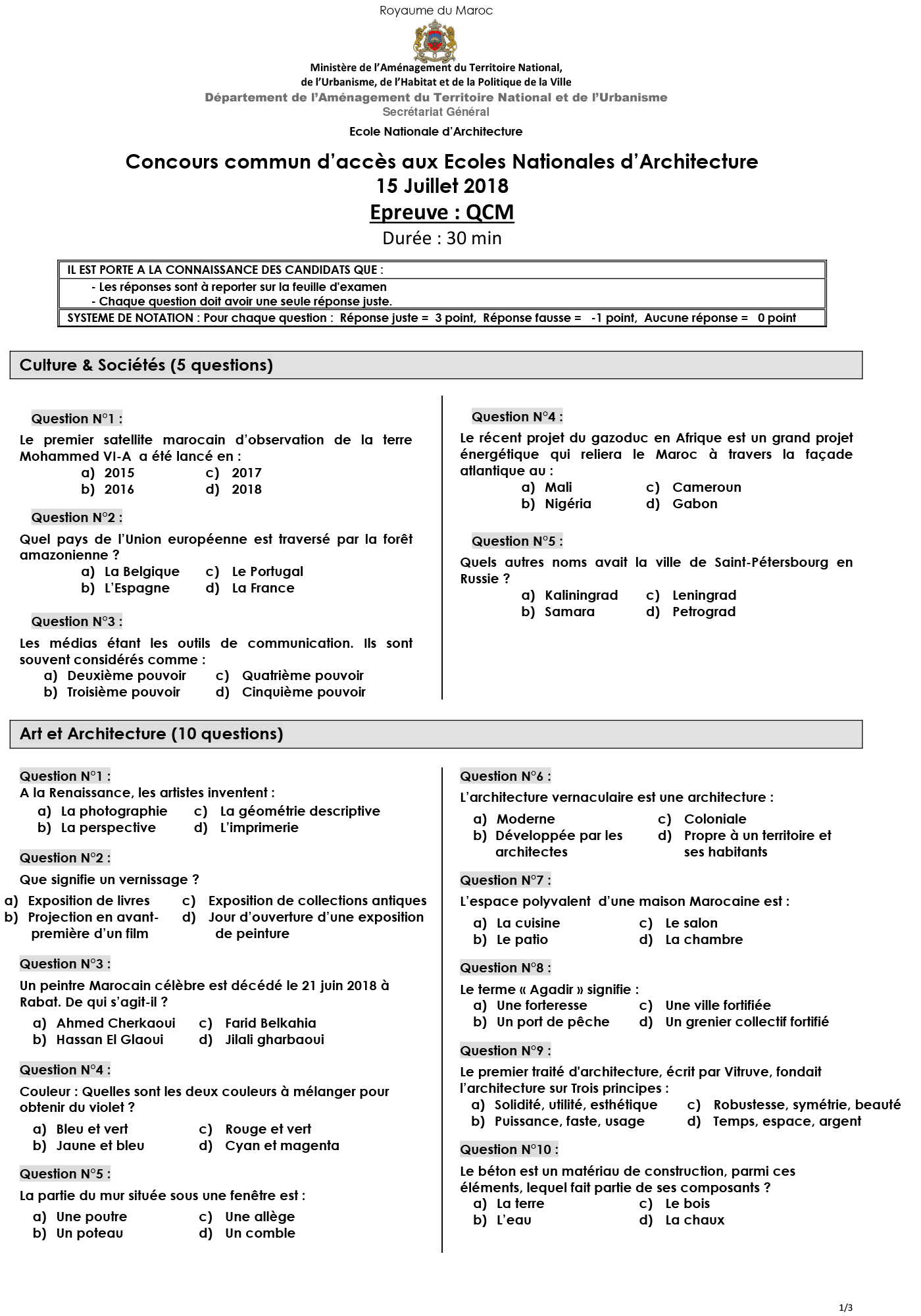 Tarik Concours d'accès à l'Ecole Nationale d'Architecture Date : 15 Juillet 2018 📝 Epreuve QCM Durée : 30 Min Culture & Sociétés (5 Questions) Art & Architecture (10 Questions) Géométrie é Perception (25 Questions)
