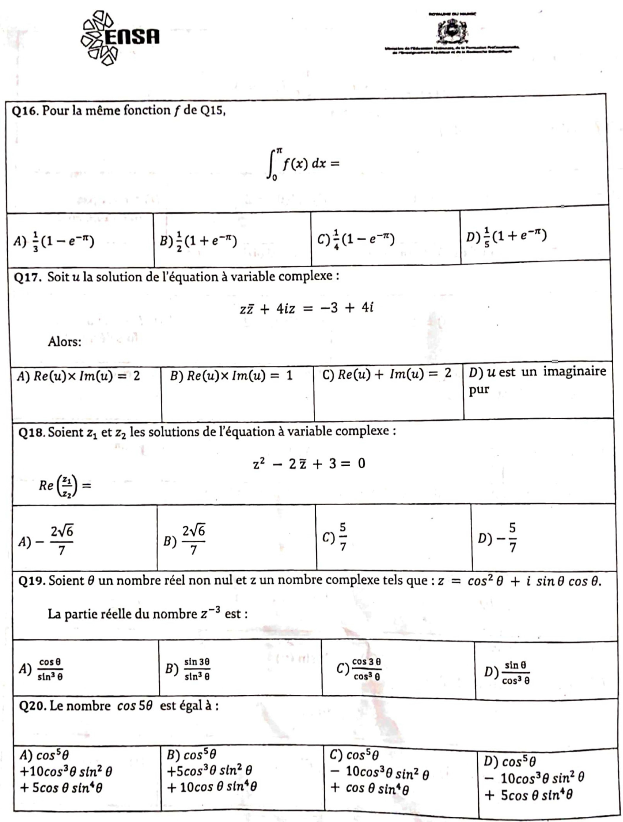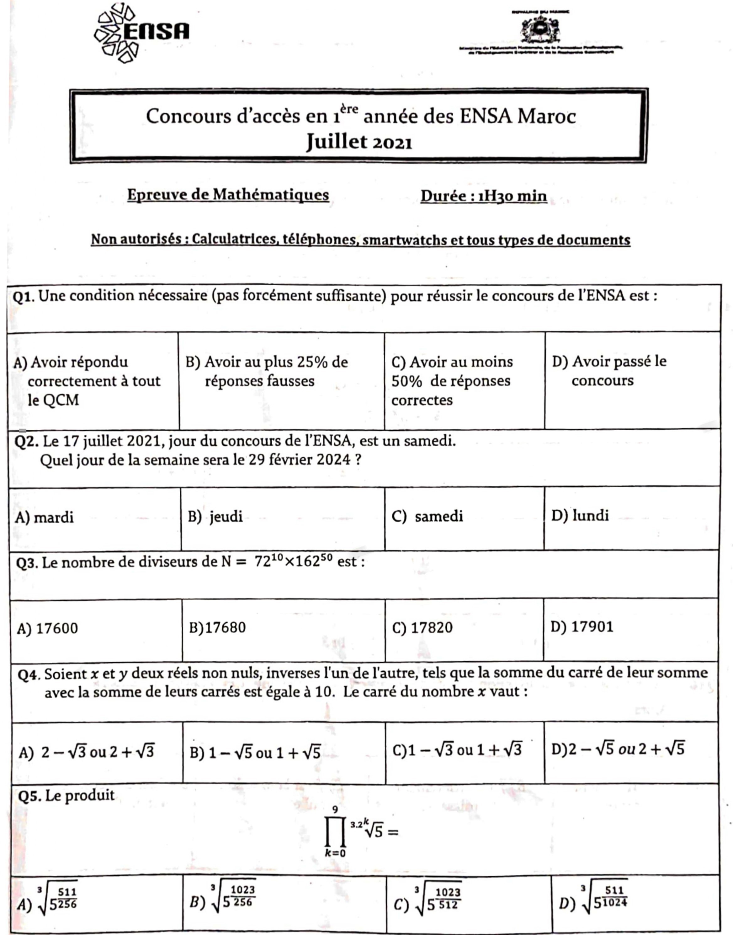 Concours ENSA 2021 - Épreuve de Mathématiques