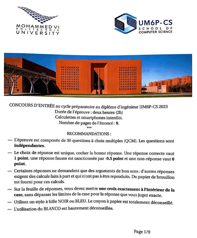 CONCOURS D'ENTRÉE au cycle préparatoire au diplôme d'ingénieur UM6P-CS 2023