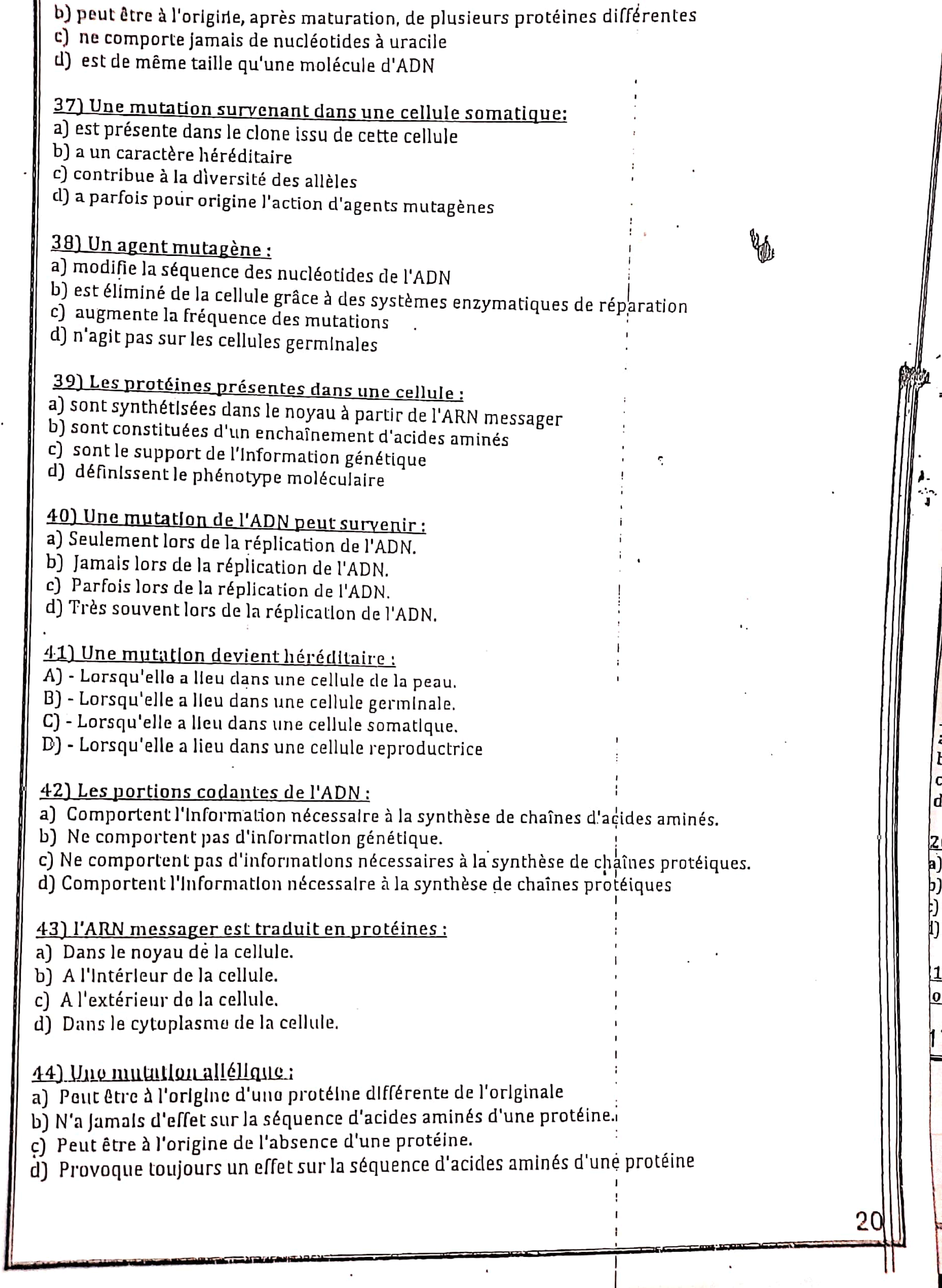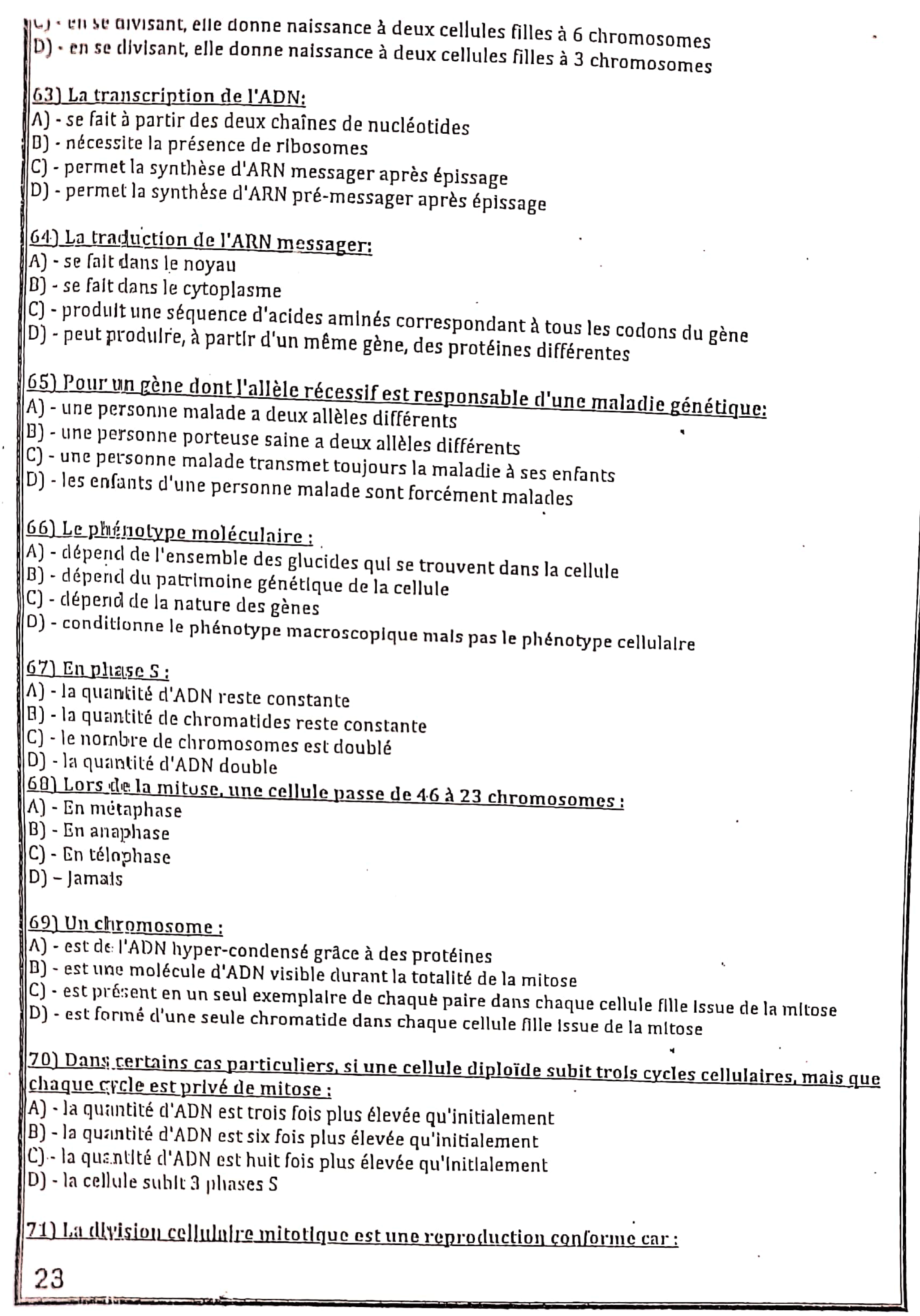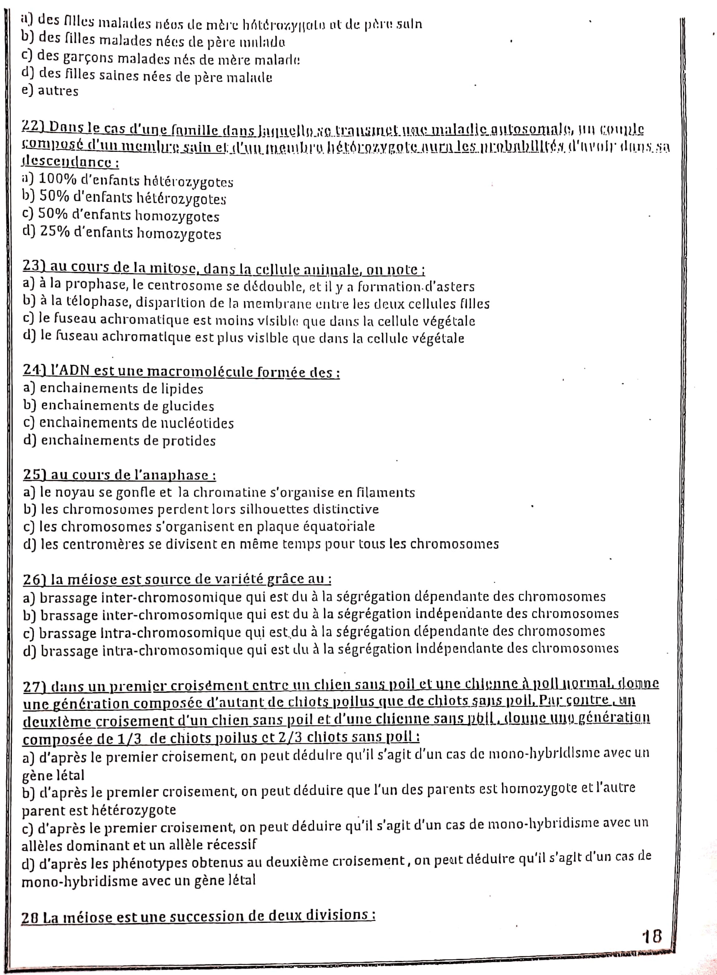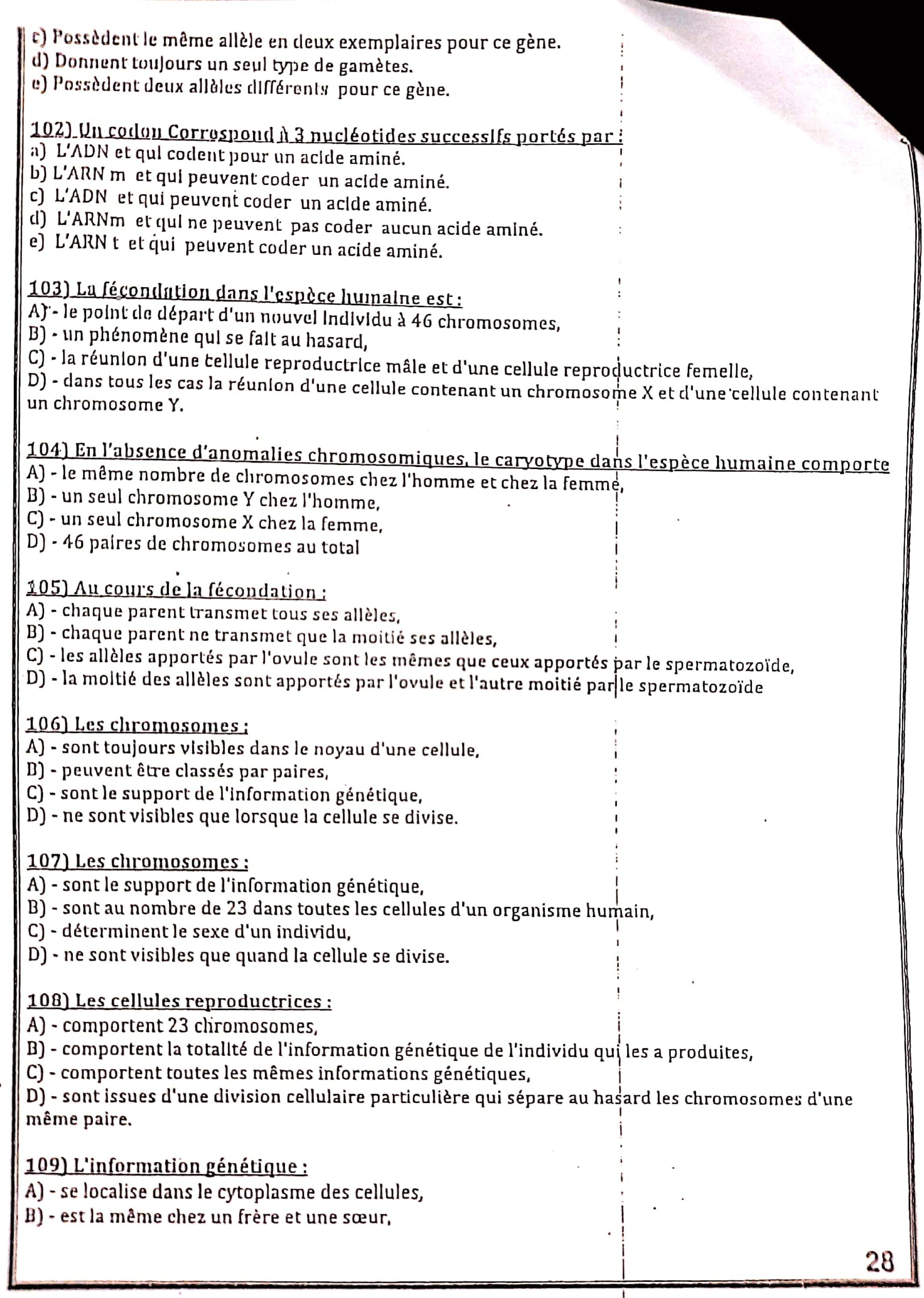 Abibou Bonjour à tous ! Je vous propose un ensemble de questions d’entraînement pour la composante SVT du concours de médecine (SCM). Ces questions sont soit basées sur des sujets précédents, soit conçues pour imiter le format et le niveau des épreuves officielles. L’objectif est de s’exercer sur des types de questions similaires afin de mieux se préparer pour le concours. ⚠️ La correction n’est pas fournie. Bon entraînement et bonne chance à tous !