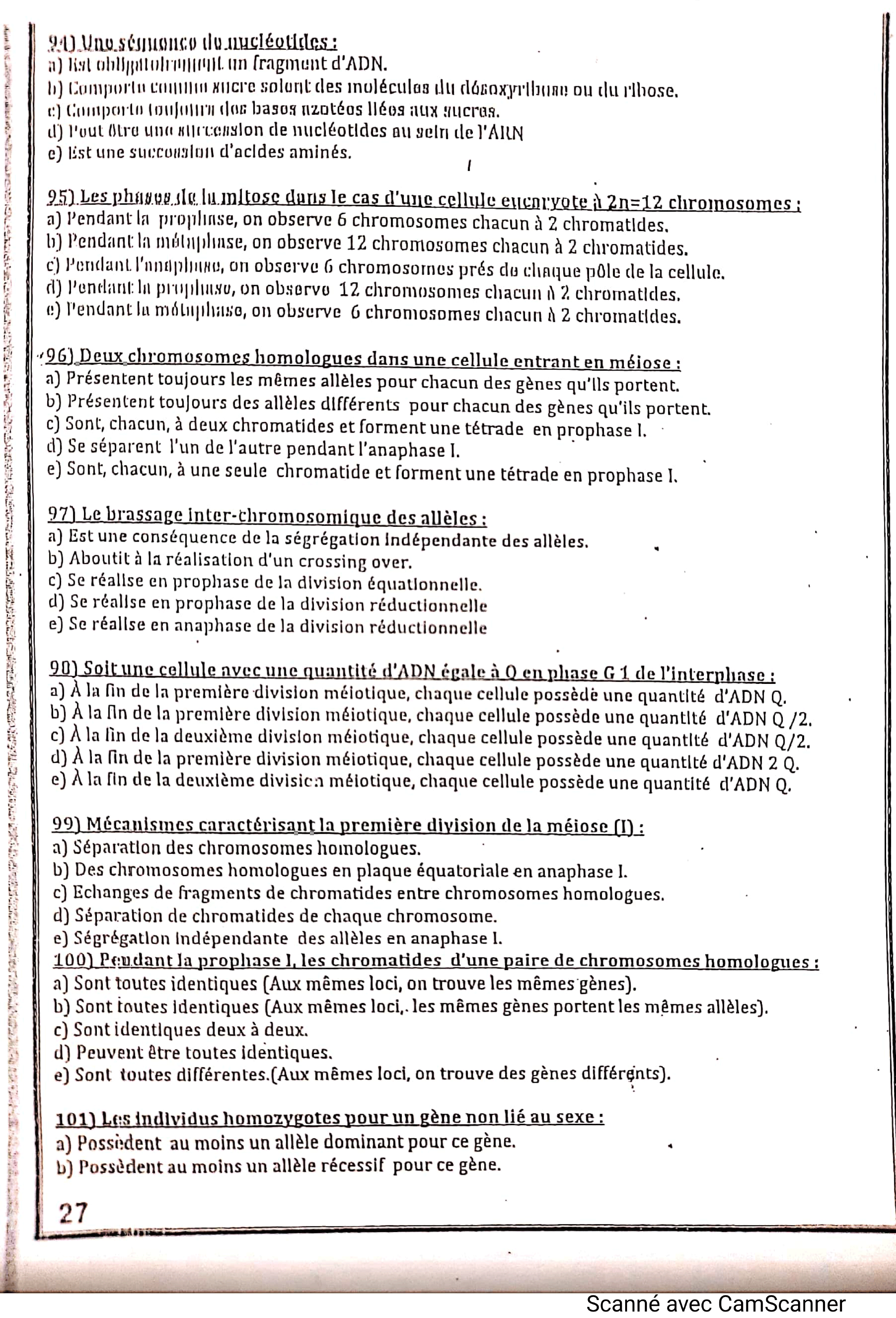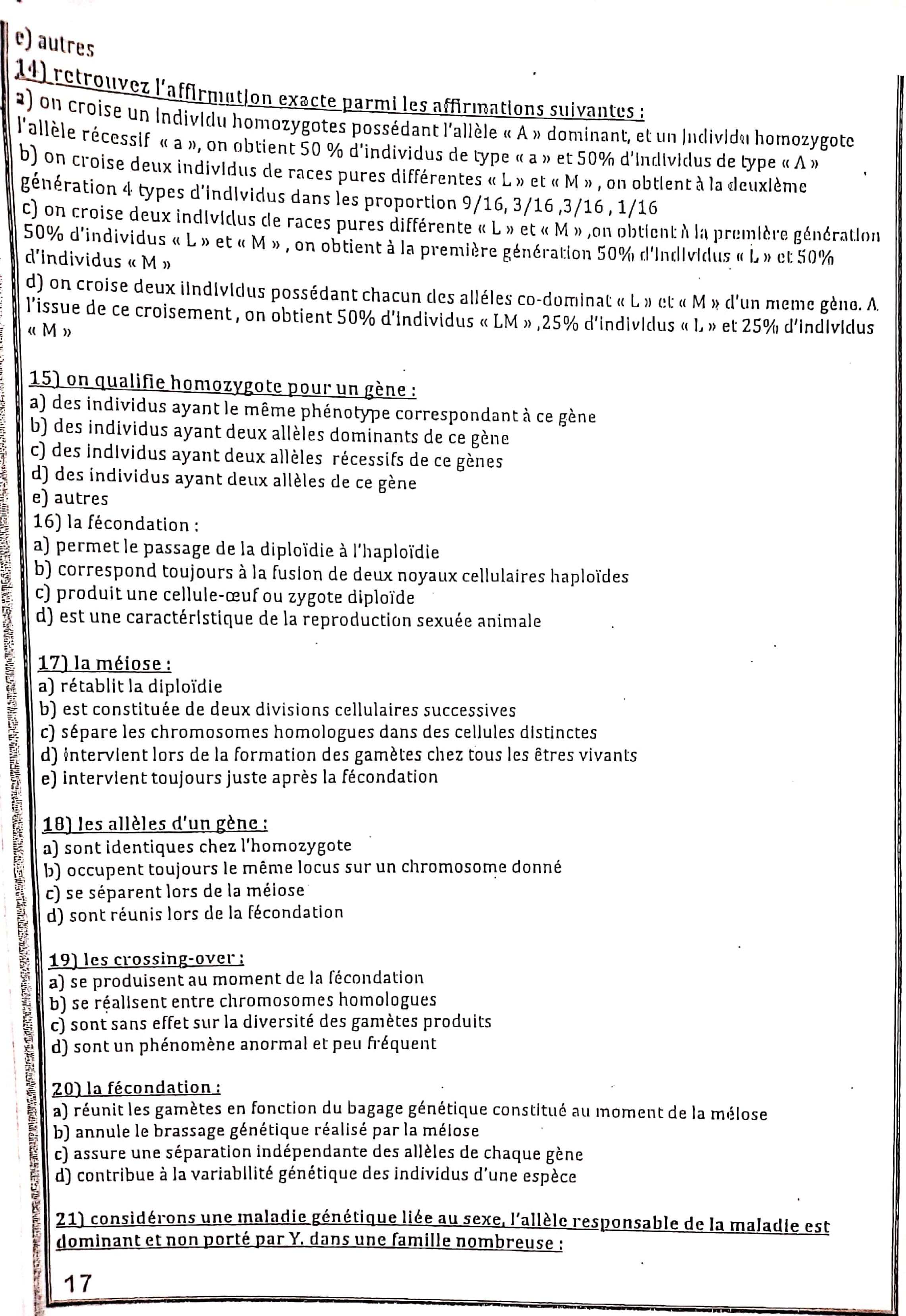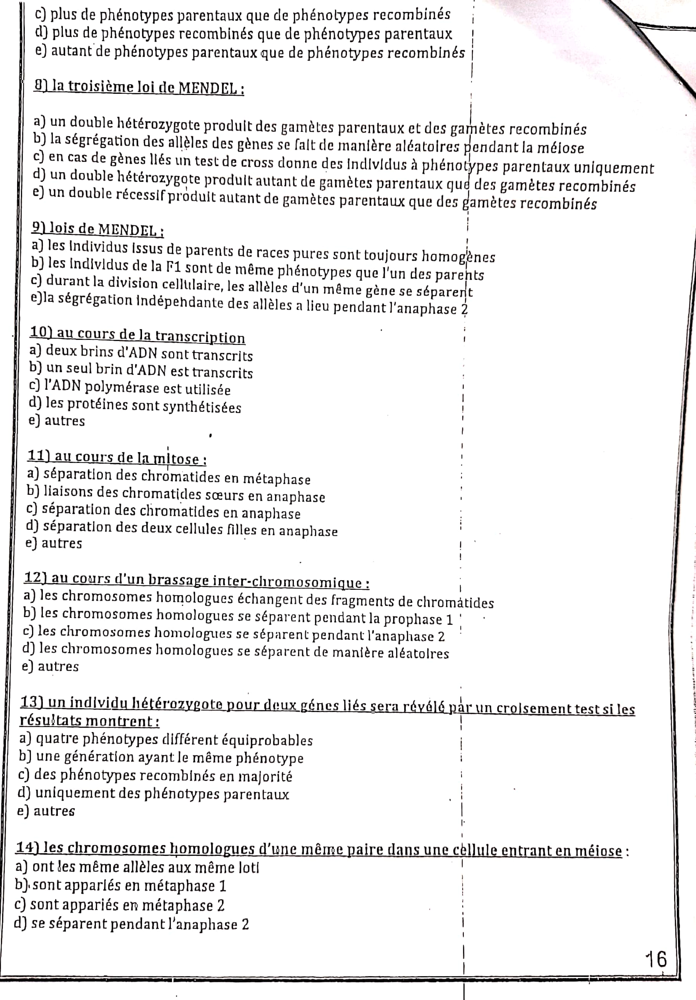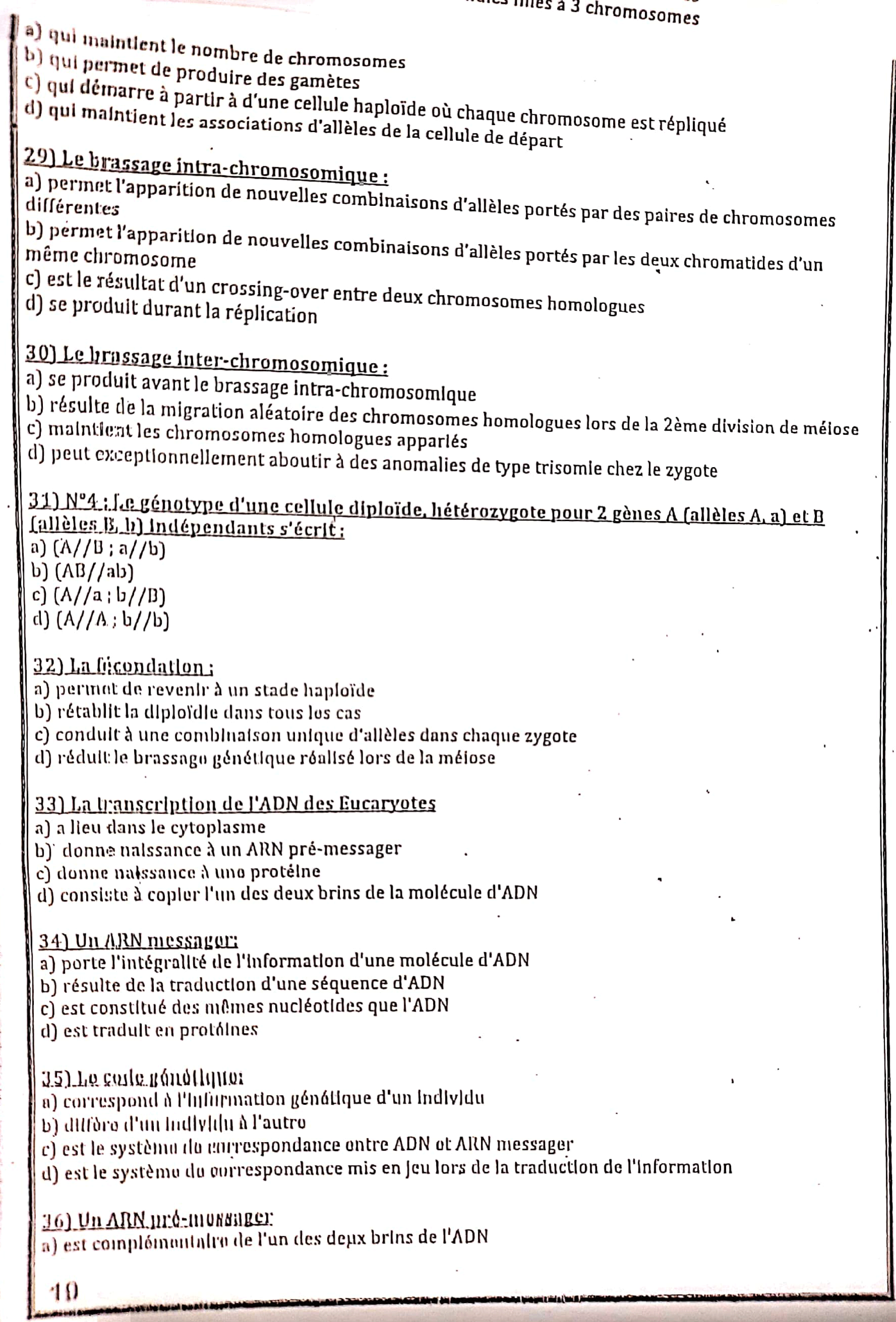 Abibou Bonjour à tous ! Je vous propose un ensemble de questions d’entraînement pour la composante SVT du concours de médecine (SCM). Ces questions sont soit basées sur des sujets précédents, soit conçues pour imiter le format et le niveau des épreuves officielles. L’objectif est de s’exercer sur des types de questions similaires afin de mieux se préparer pour le concours. ⚠️ La correction n’est pas fournie. Bon entraînement et bonne chance à tous !
