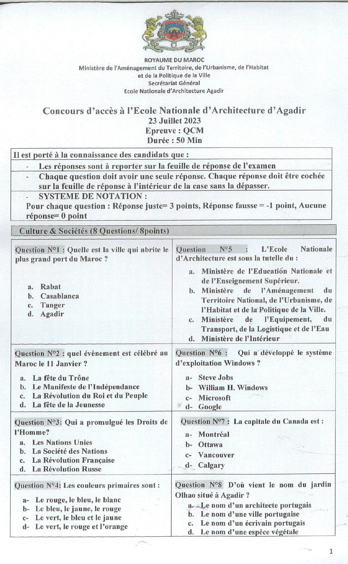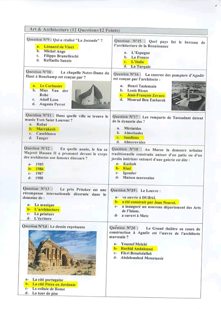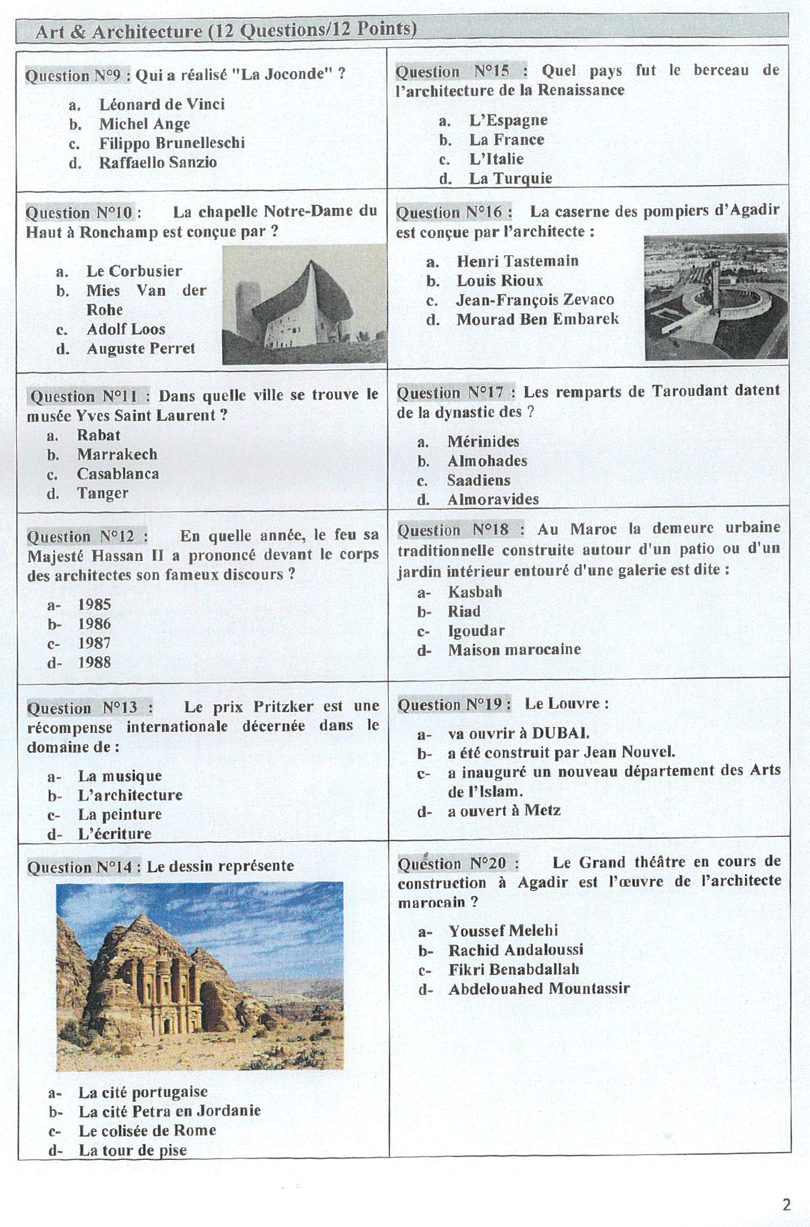 SoufianeJ Epreuve : QCM Durée : 50 Min Culture & Sociétés (8 Questions) Art & Architecture (12 Questions) Géométrie é Perception (20 Questions) Langue & Compréhension (10 Questions) -