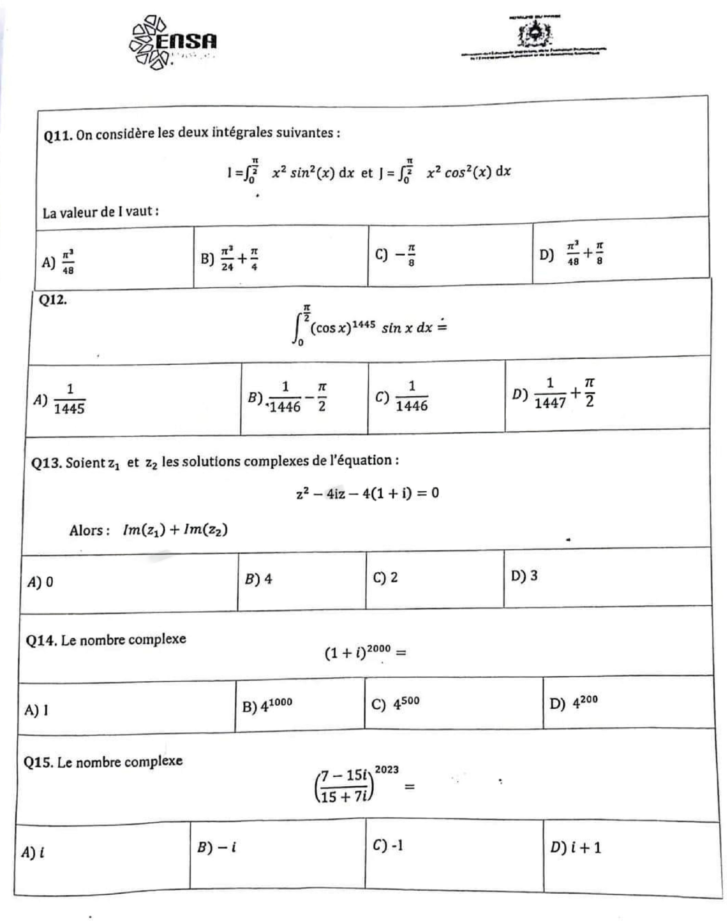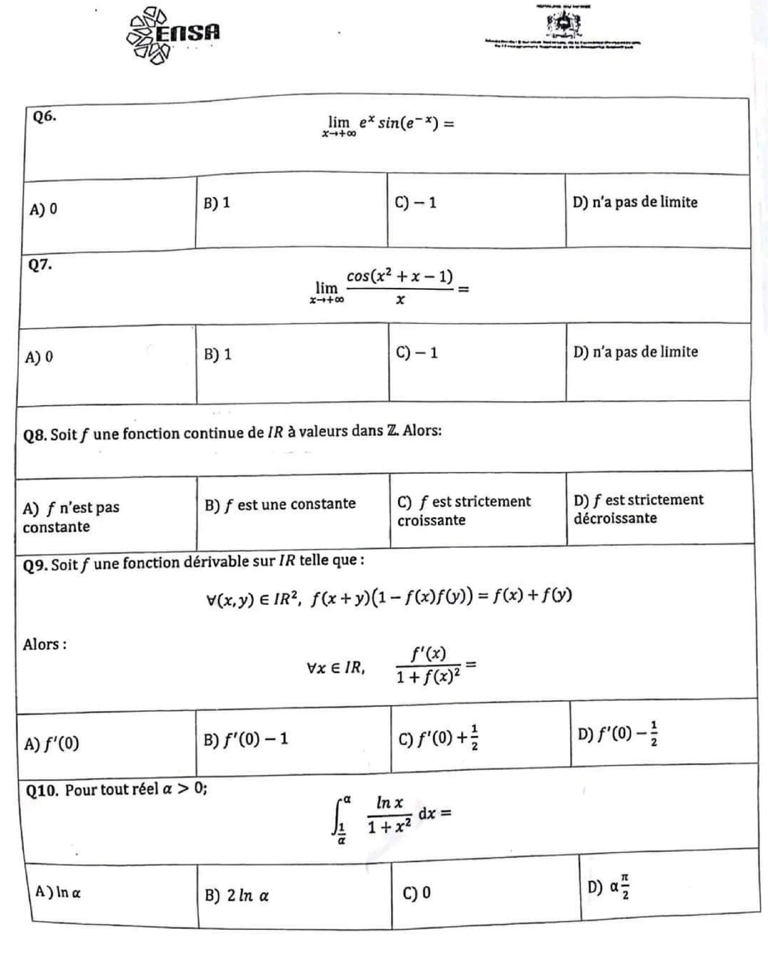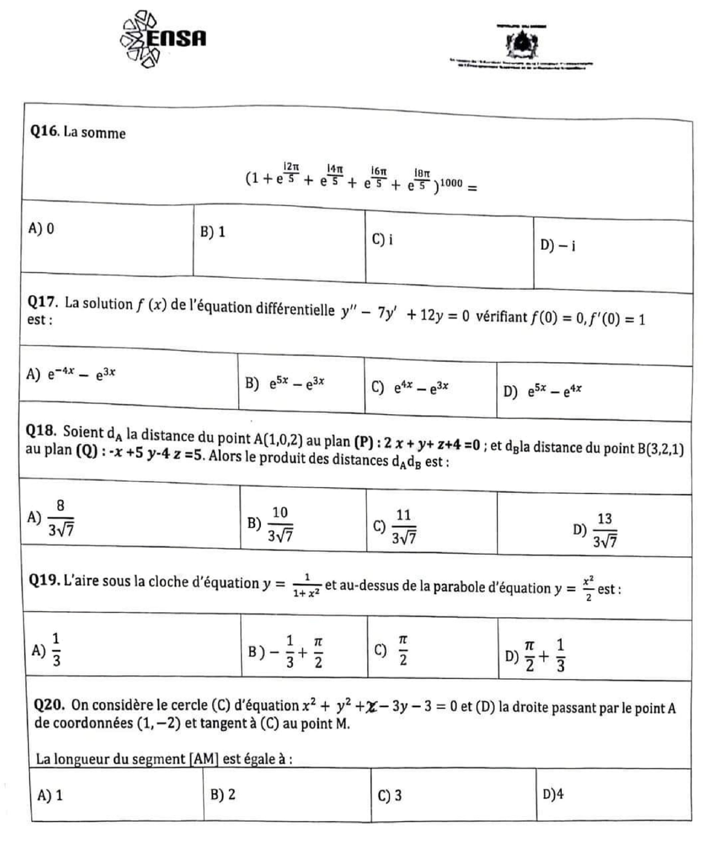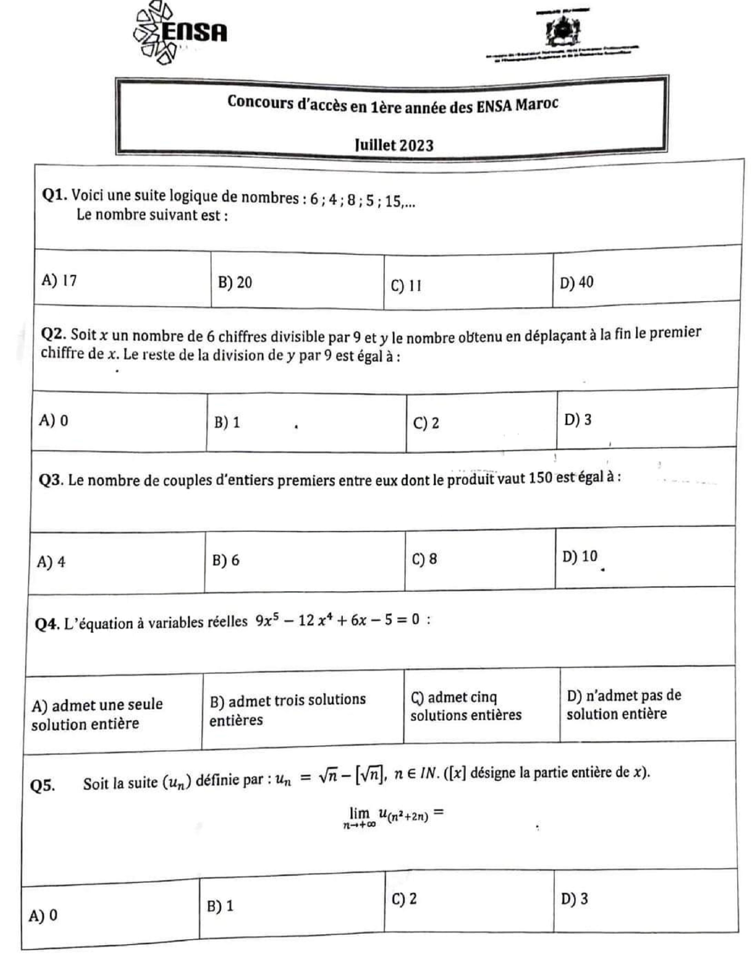 Épreuve mathématiques concours ENSA 2023