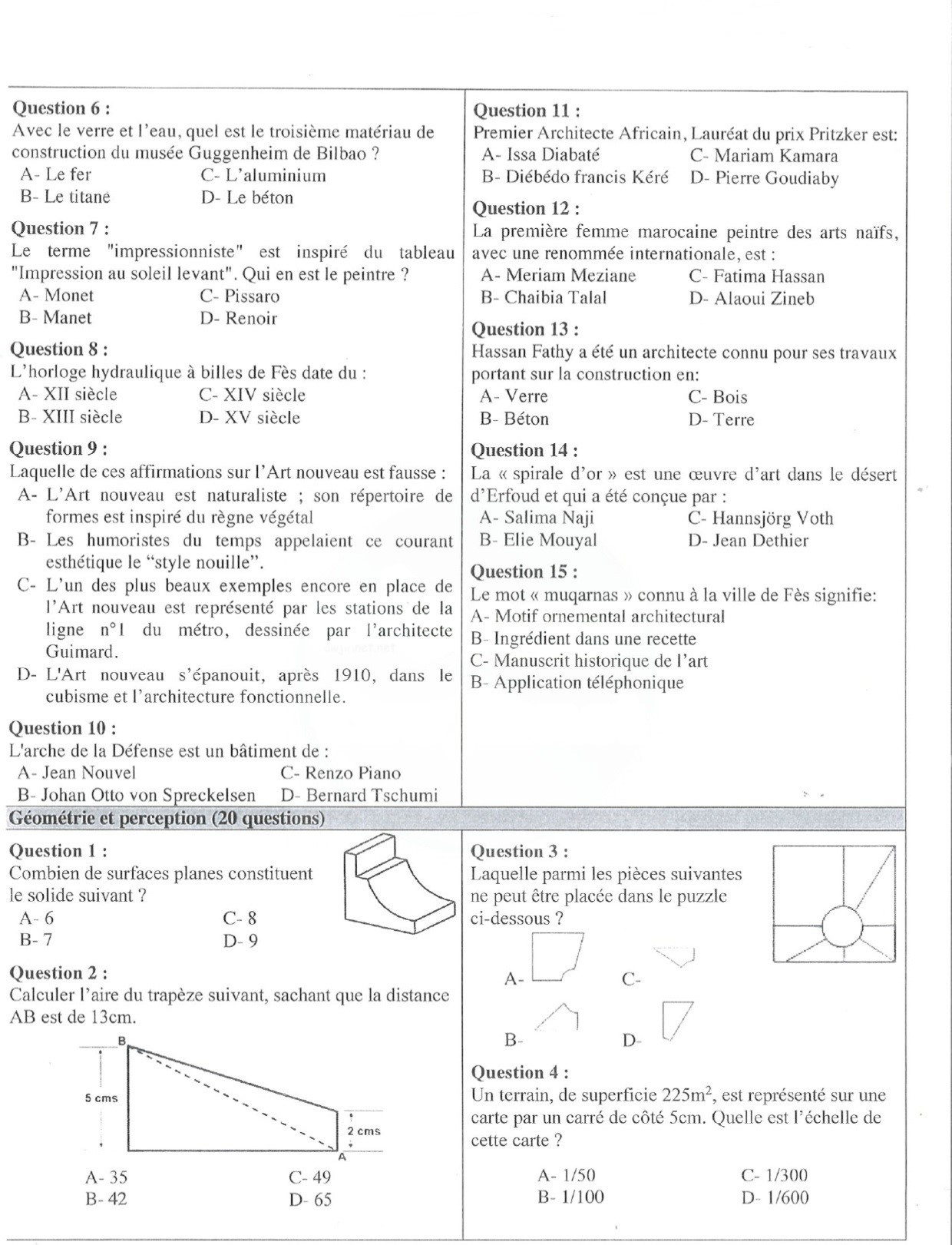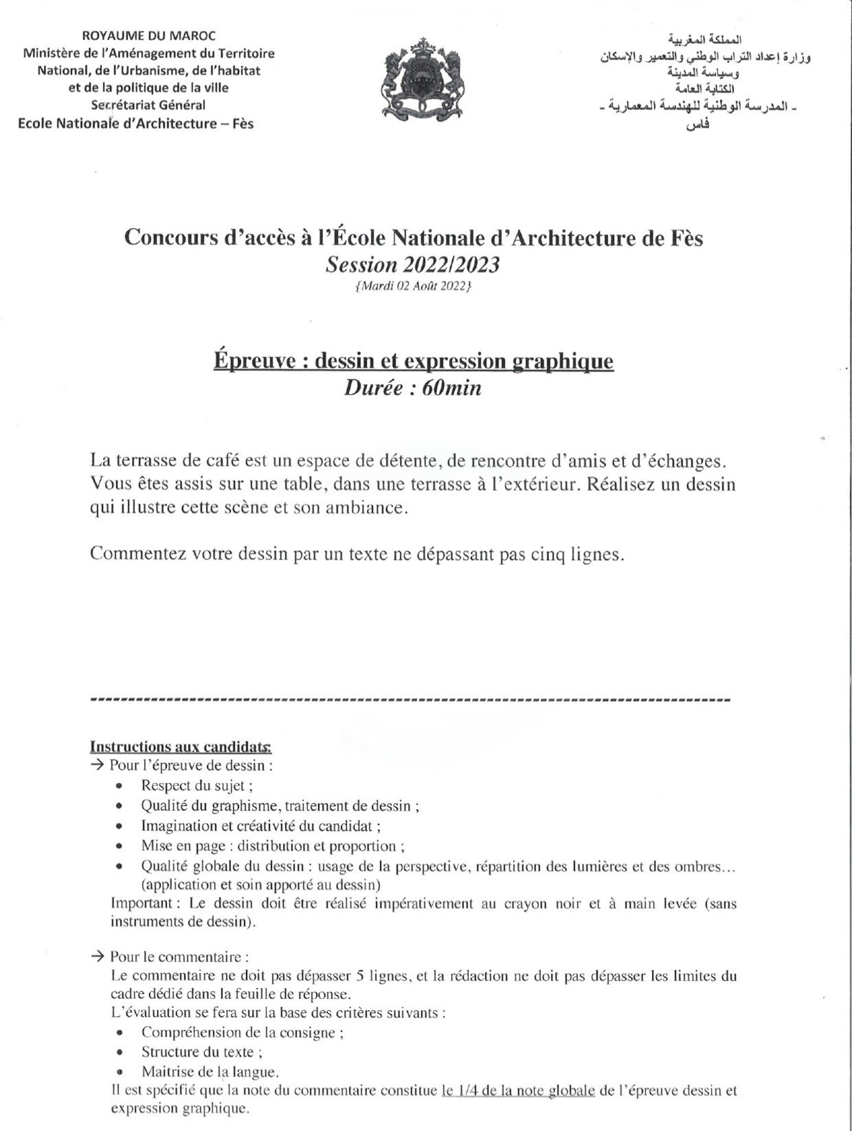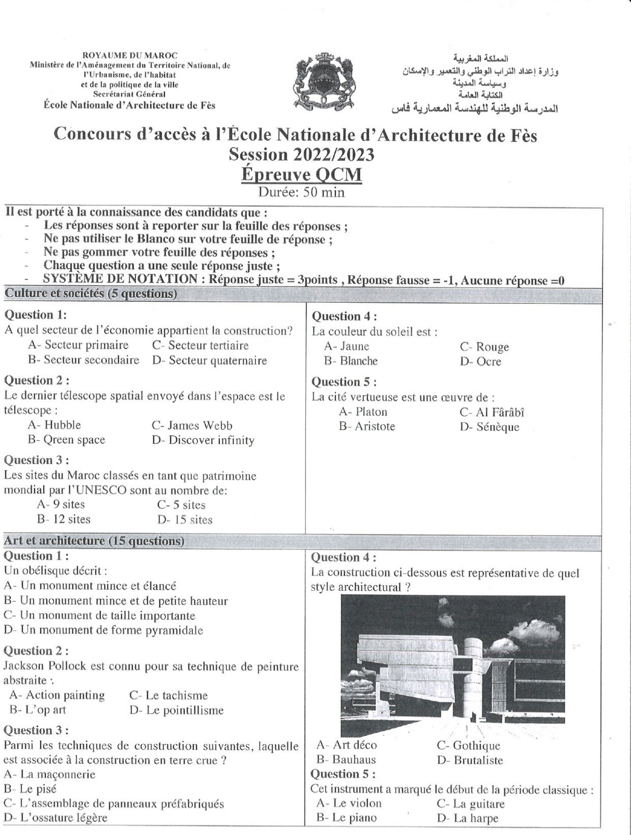 SoufianeJ Concours d'accès à l'École Nationale d'Architecture de Fès - Session 2022/2023 📝 Epreuve QCM 📝 Epreuve Dessin et Expression Artistique